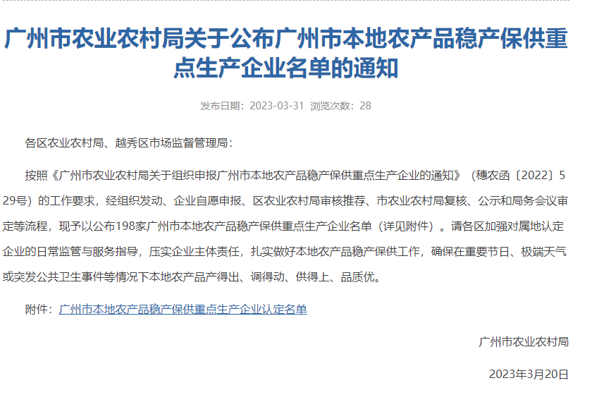 为高效开展本地农产品生产调度,建立健全本地农产品稳产保供长效机制,广州市农业农村局开展了新一轮的农产品稳产保供重点生产企业申报工作,遴选一批社会责任感强、生产规模较大的优质农产品生产企业作为广州市农产品稳产保供重点生产企业。