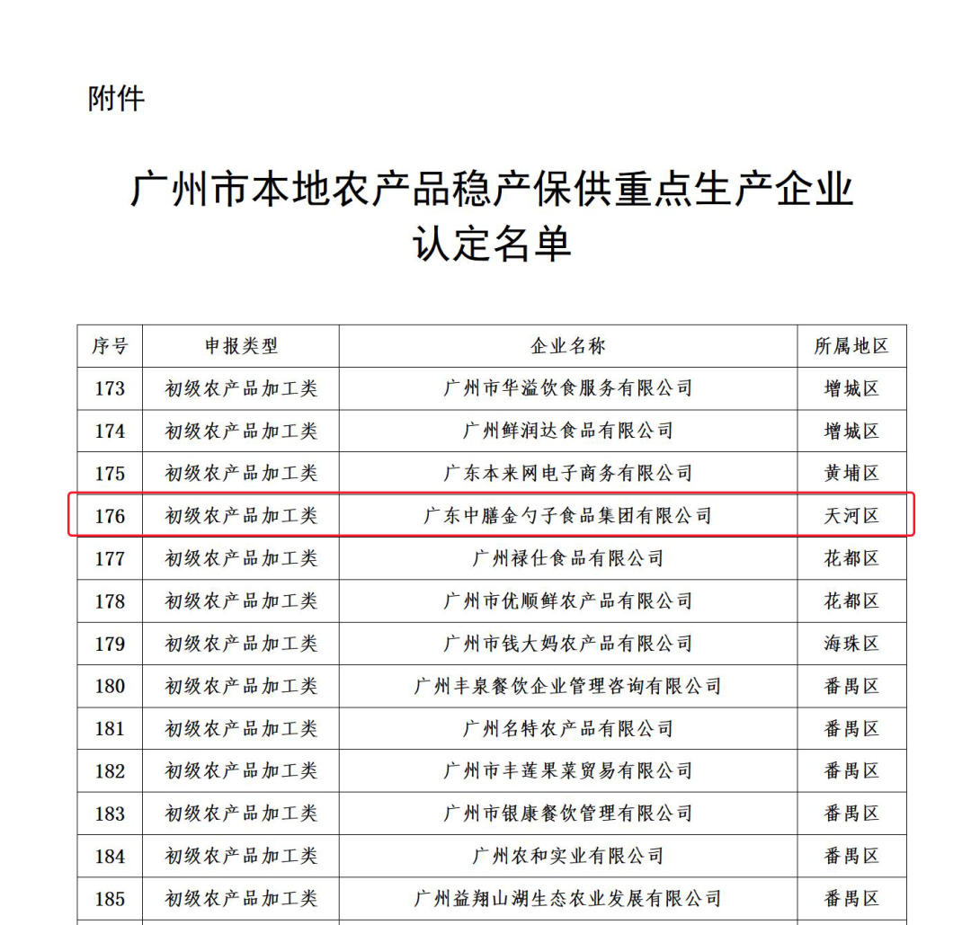 2023年3月31日,广州市农业农村局在官网公布了一批农产品稳产保供重点生产企业名单(共198家),其中“广东中膳金勺子食品集团有限公司”被认定为“初级农产品加工类”稳产保供重点生产企业。